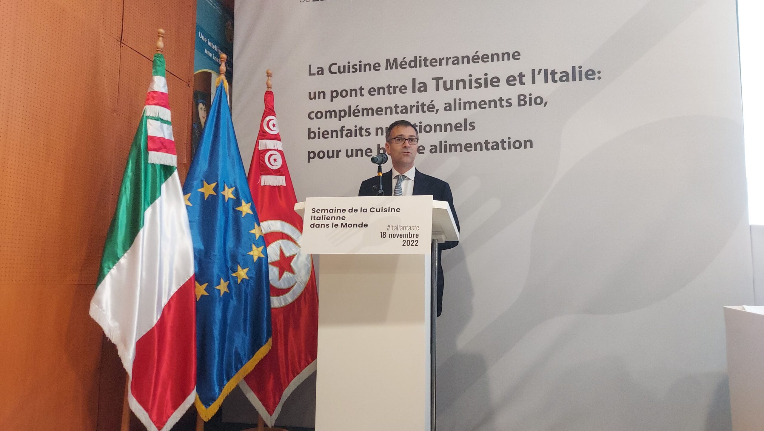 Tunisi, 20 novembre 2022 – Si è conclusa venerdì 18 novembre la Settimana della Cucina Italiana in Tunisia con un evento organizzato da ICE AGENZIA “La Cuisine Méditerranéenne un pont entre la Tunisie et l’Italie: complémentarité, aliments Bio, bienfaits nutritionnels pour une bonne alimentation”, presso l’Institut des Hautes Etudes Touristique de Sidi Dhrif. La VII edizione della Settimana della Cucina Italiana nel Mondo, iniziativa promossa dal Ministero degli Affari Esteri e della Cooperazione Internazionale italiano, è stata celebrata in tutto il mondo dal 14 al 20 novembre 2022, con una serie di eventi organizzati dalle Istituzioni del Sistema Italia quali rete diplomatico-consolare italiana, Istituti Italiani di Cultura, Enit e ICE Agenzia. “Sono arrivato in Tunisia da circa un mese e sono felice di rendere uno dei miei primi discorsi in questa occasione – ha dichiarato l’Ambasciatore d’Italia in Tunisia, Fabrizio Saggio, nel suo discorso inaugurale aggiungendo che – dal 2015 la Settimana della Cucina del Mondo viene celebrata in tutte le ambasciate italiane nel mondo per promuovere non solo la cucina e i prodotti made in Italy, ma soprattutto la grande cultura italiana di cui la nostra cucina è forma d’espressione. L’edizione di quest’anno ha come temi convivialità, sostenibilità e innovazione”. L’evento è stato organizzato in collaborazione con il Ministero dell’Agricoltura della Tunisia, AssoBio Associazione Nazionale delle imprese di produzione, trasformazione e distribuzione dei prodotti biologici naturali, e Università di Parma. Il panel di discussioni è stato moderato dalla nuova direttrice dell’agenzia ICE in Tunisia, Francesca Tongo, e si concluso con uno show cooking e Master class dell’Executive Chef italiano Alessandro Fontanesi dell’Hotel Four Season Gammarth di Tunisi insieme agli studenti della Scuola IHET e infine la degustazione del menu preparato da studenti tunisini premiati a fine serata dall’Ambasciatore. L’intero menu è stato realizzato con prodotti italiani biologici di eccellenza, pronti a fare il loro ingresso sul mercato tunisino. L’ambasciatore ha sottolineato come la Dieta Mediterranea rappresenti un modello di Sostenibilità alimentare, al rapporto uomo, natura e territorio e salvaguardia dell’ambiente tramite alimenti biologici.